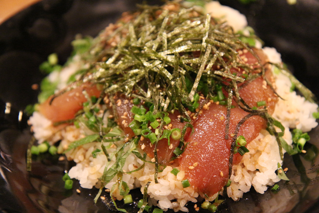 ●お料理は、中落ち、かぶと焼き、炙りピザ、ステーキ、漬け丼など